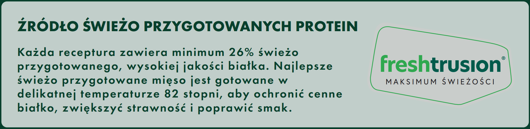 Nasze receptury powstają dzięki innowacyjnej technologii Freshtrusion®, która pozwala gotować mięso w niskiej temperaturze (82°C), zachowując jego wartości odżywcze, wysoką strawność i wyjątkowy smak. Każdy krok – od odbioru świeżego mięsa z farm i łowisk, aż po delikatne przygotowanie i formowanie chrupiących krokietów – odbywa się pod ścisłą kontrolą jakości.
